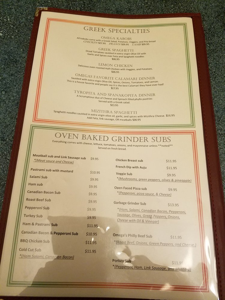 “ Best place, Great food, and totally worth the price. Never leave hungry. This is my favorite spot and so worth the drive. Stop in, and you will leave content, fat, and happy. Granite Falls is the perfect spot to stop in at Omega Pizza and fill your hunger. Try the Garbage Grinder by Barbara. It's a meal in itself. Play a game of pool, while you wait. Pasta, Beer, Wine, water, tea. Sit back and listen to the music while you wait. It's very comfortable and inviting. ”